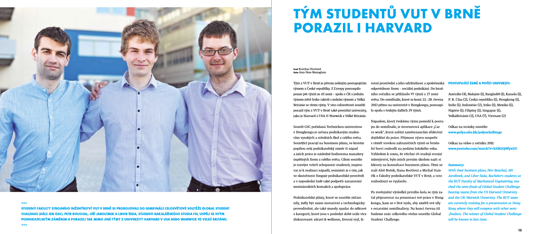 Internetová aplikace týmu FSI "Car to work" , která nabízí zaměstnancům efektivní dojíždění do práce, uspěla mezi téměř stovkou zahraničních projektů. Studenti FSI svým business plánem porazili i zástupce prestižních univerzit, jako je Harvard z USA či Warwick z Velké Británie. Nyní se připravují na červnové semifinále soutěže, které proběhne v Hongkongu. Budou jediným týmem, který bude zastupovat Českou republiku.