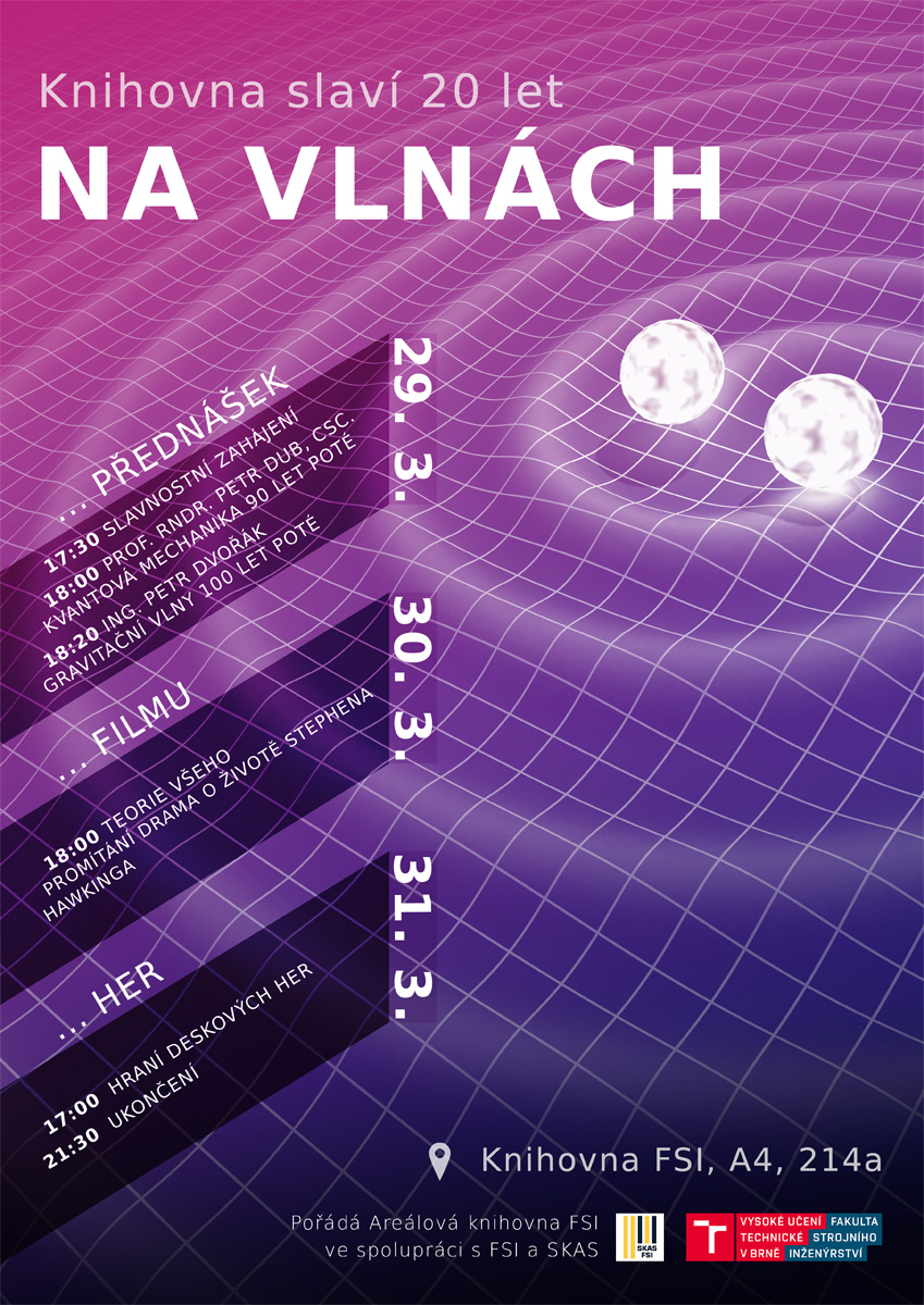 U příležitosti nadcházejících oslav výročí připravil kolektiv knihovny ve spolupráci s FSI a SKAS FSI na tři poslední březnové dny zajímavé akce. Přijďte si poslechnout přednášky o zlatém věku fyziky, o gravitačních vlnách, kouknout na zajímavý film “Teorie všeho” nebo jen zahrát nějakou deskovou hru. Z nabízeného programu si vybere každý. Těšíme se na vás v prostorách Areálové knihovny FSI ve dnech 29.–31. března. Pro informace o začátcích jednotlivých programů sledujte